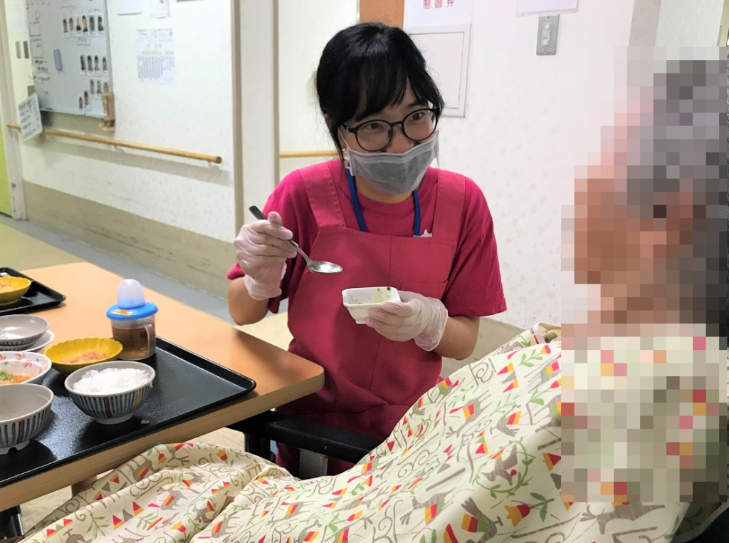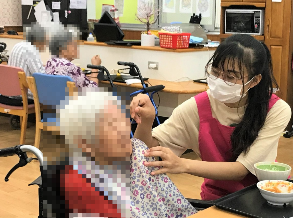 When I help and feed, the residents make facial expressions to tell me it is delicious, and when I bathe them, they say “It feels good.” Seeing their smiles makes me happy, too. I did not like changing diapers at first, but I soon got used to it and became fine with it.