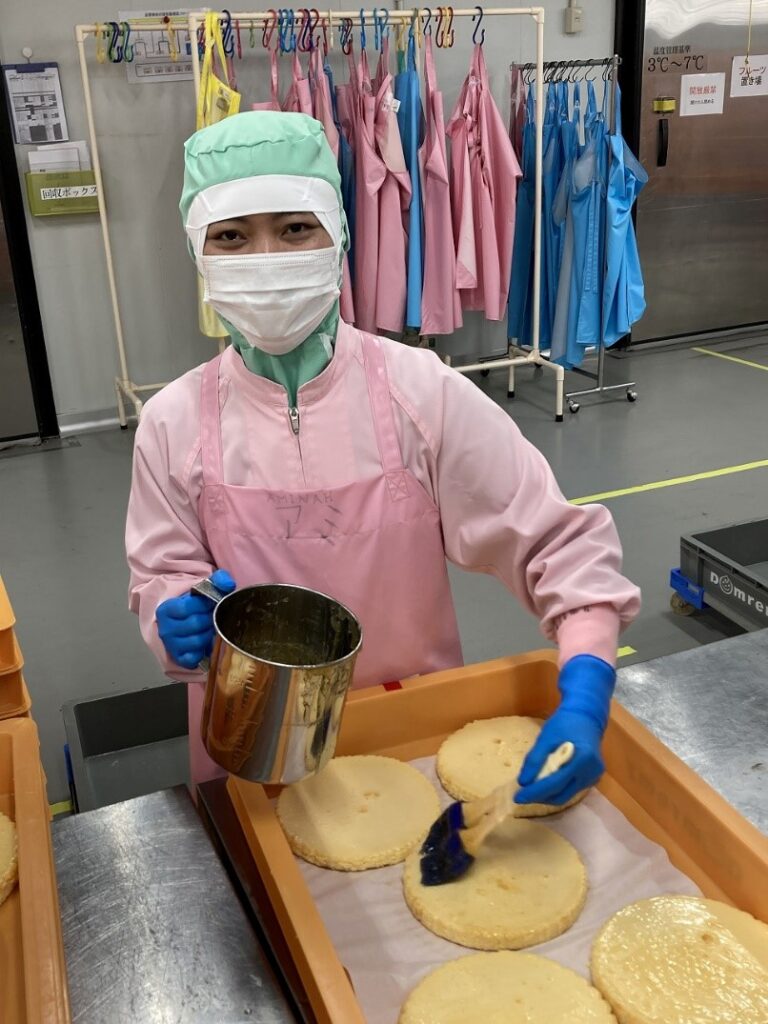 I work at Donremi Okayama Factory, where I am responsible for the cupcake and roll cake production line. I always strive to finish quickly, accurately, and beautifully.